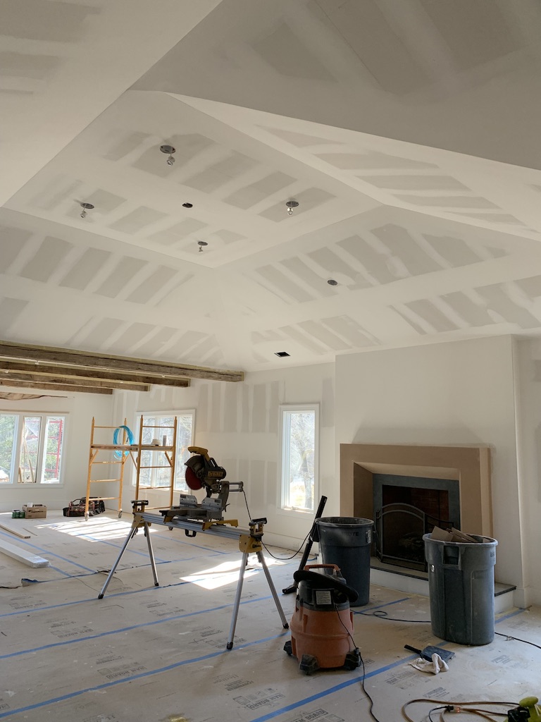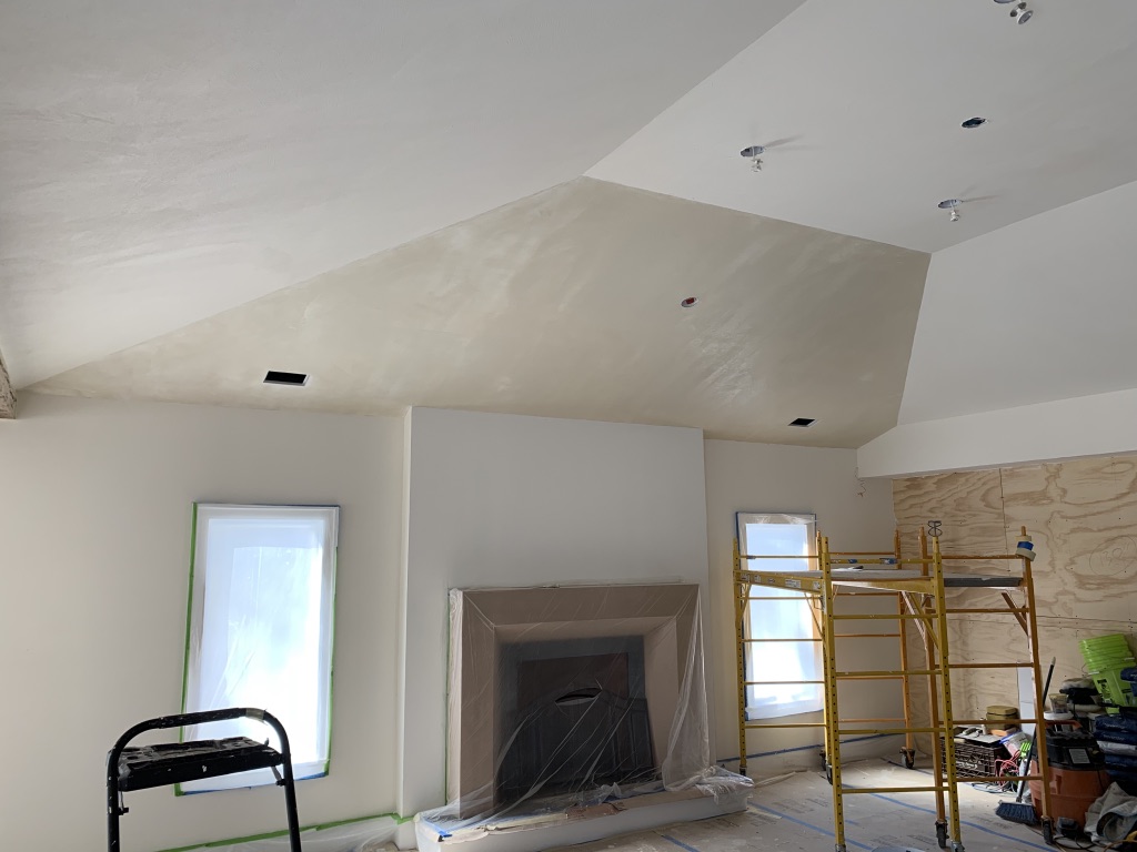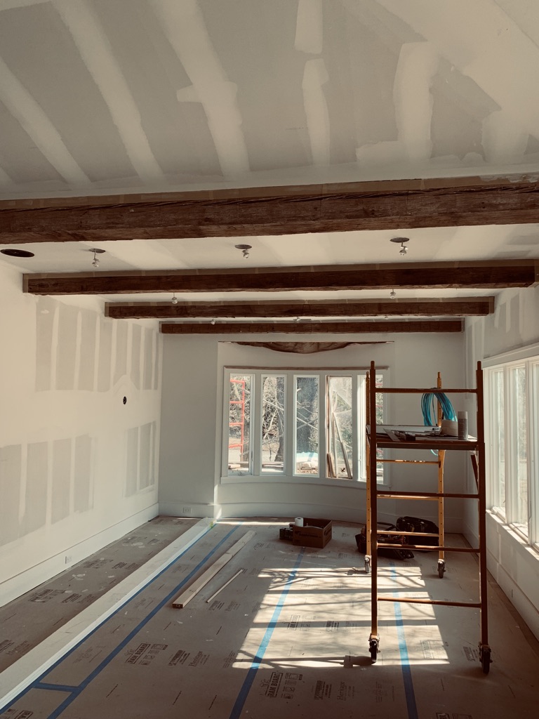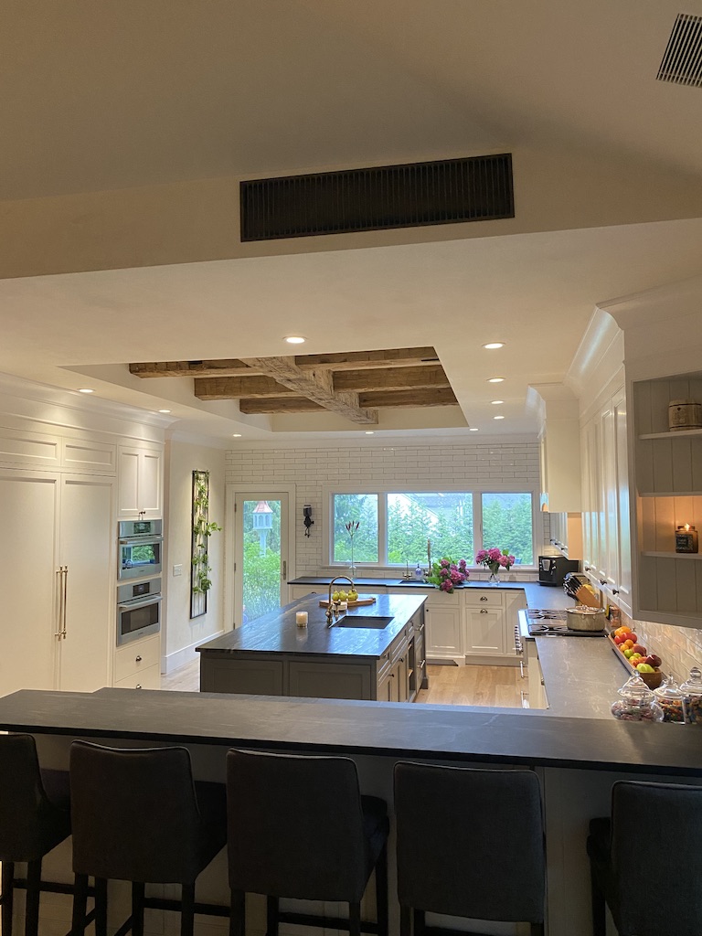 2000 square foot open floor plan kitchen dining room and family room. Rustic reclaimed flooring and beams; custom millwork; and hand-applied plaster wall finish. Completed the clients’ dream space. Fulfillment!